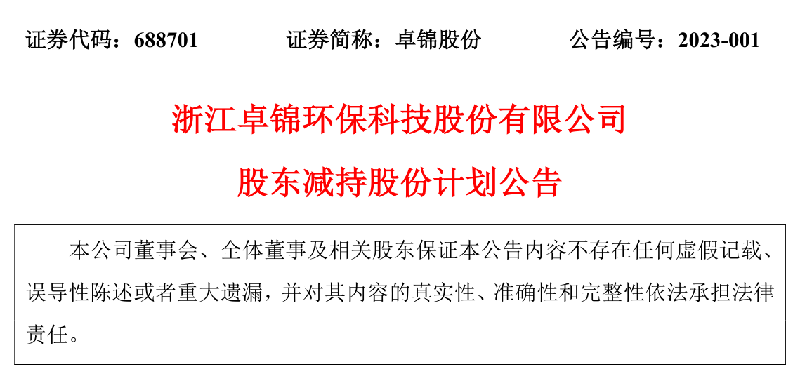 浙江卓錦環保科技股份有限公司股東減持計劃公告