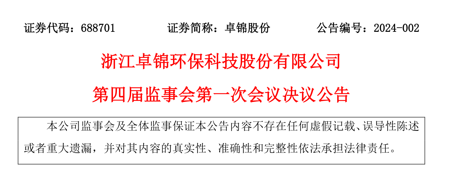 浙江卓錦環??萍脊煞萦邢薰镜谒膶帽O事會第一次會議決議公告