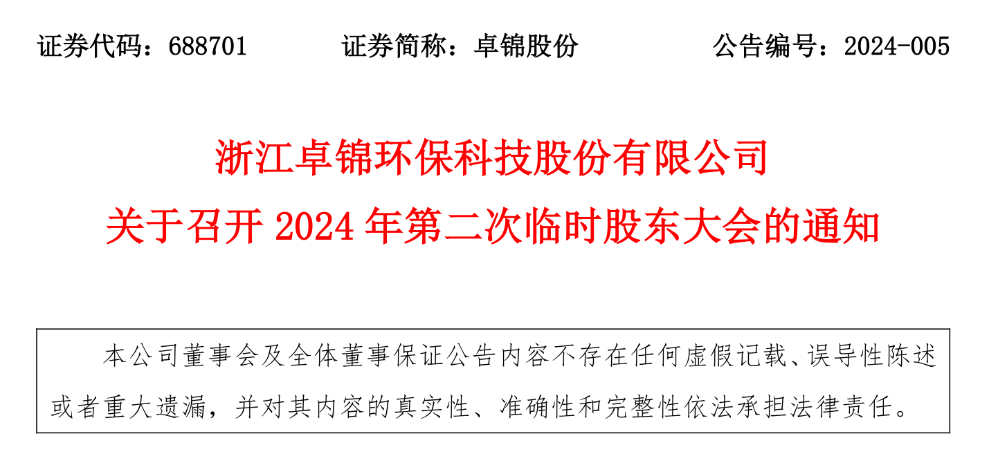 浙江卓錦環(huán)保科技股份有限公司關于召開2024年第二次臨時股東大會的通知