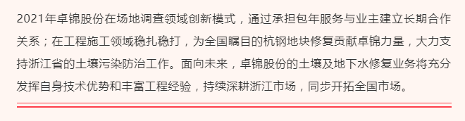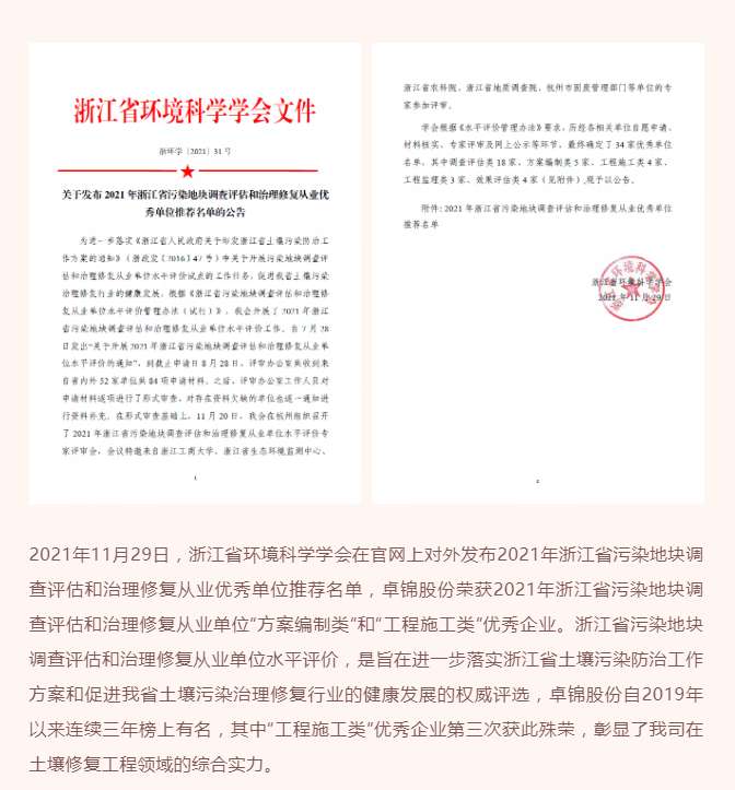 高度認(rèn)可|卓錦股份獲評2021年浙江省污染地塊調(diào)查評估和治理修復(fù)從業(yè)單位“方案編制類”和“工程施工類”優(yōu)秀企業(yè)